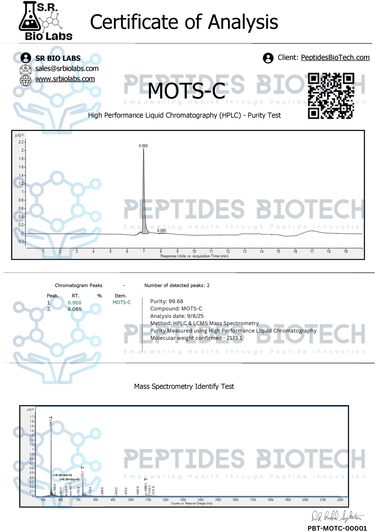 We offer high-purity MOTS-c, a novel mitochondrial-derived peptide recognized for its significant role in regulating cellular metabolism. This 16-amino acid peptide is encoded by the mitochondrial genome and is supplied as a lyophilized powder to ensure maximum stability and bioactivity for your in-vitro research needs.